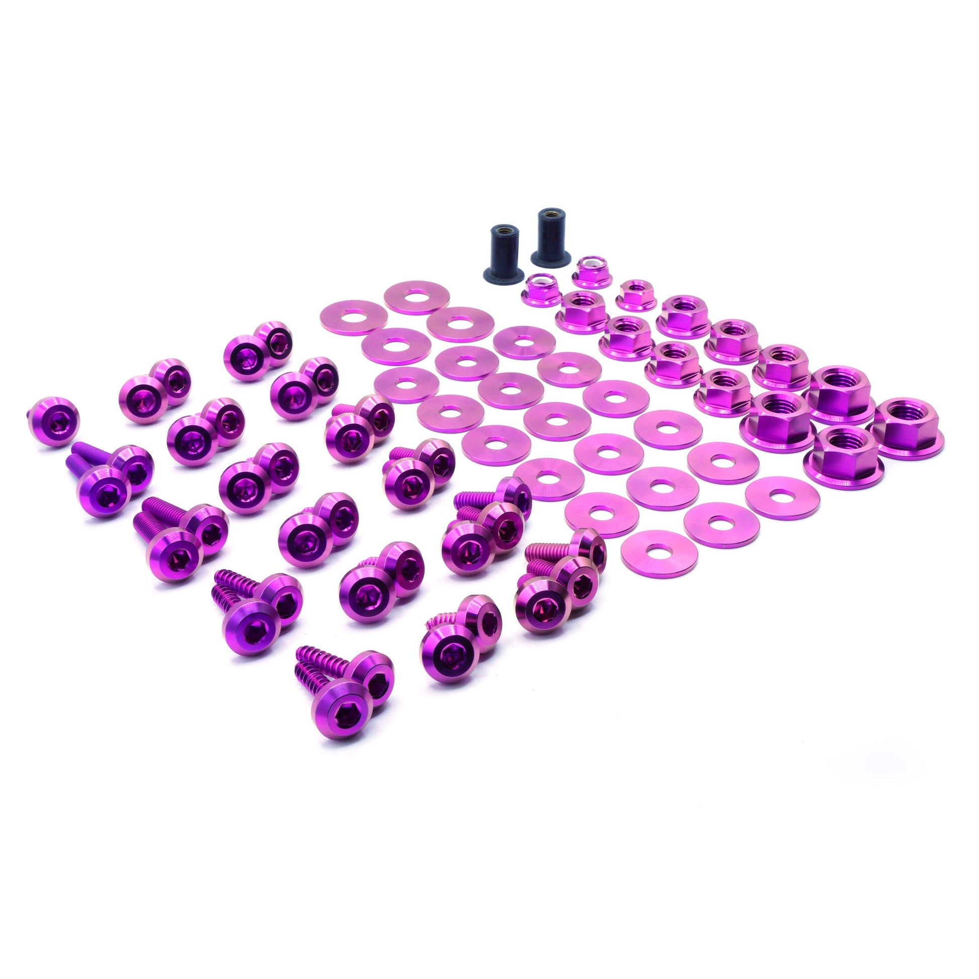 Our 73 piece Stage 2 engine bay kit includes bolts, screws, nuts, and washers manufactured from extremely durable, anticorrosive, and lightweight GR5 titanium metal. The kit is designed for the BMW E46 M3.