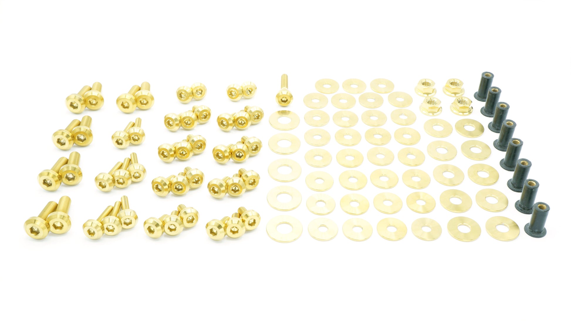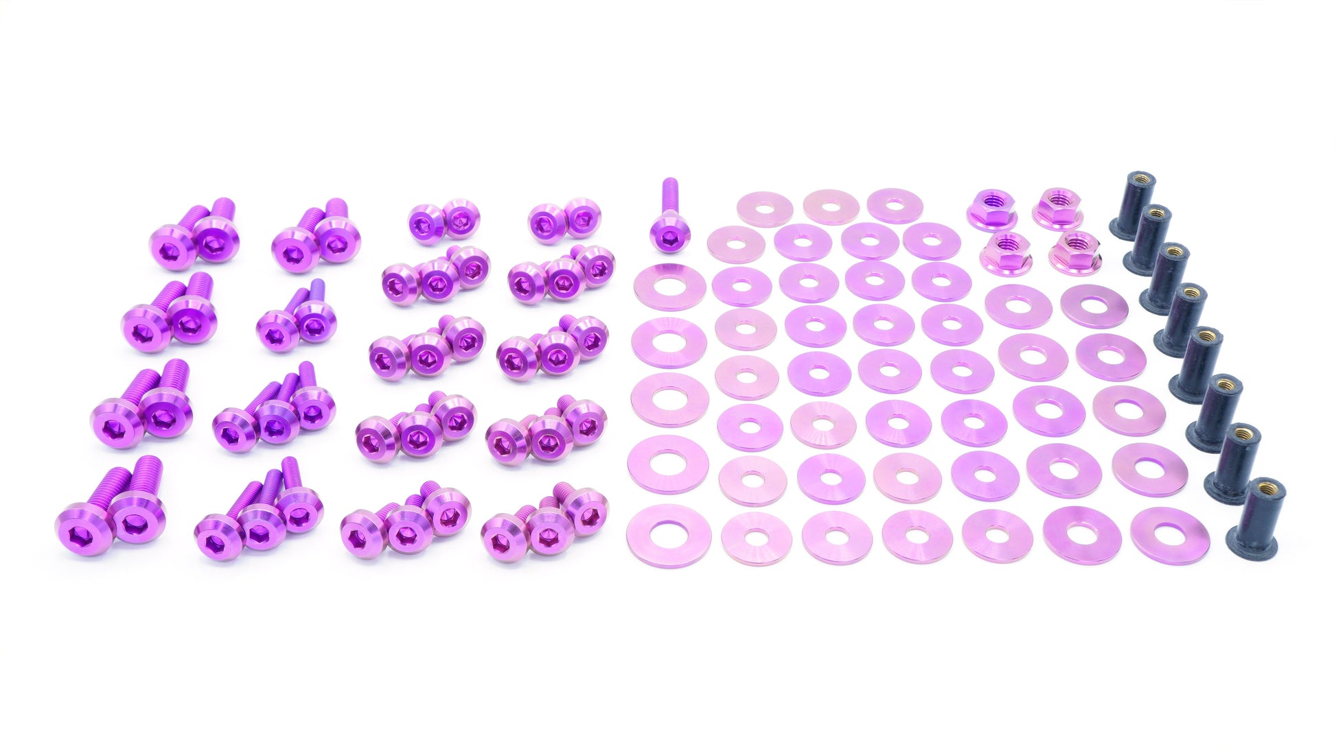 This 105 piece kit includes bolts, screws, nuts, well nuts, and washers manufactured from extremely durable, anticorrosive, and lightweight GR5 titanium metal. This kit replaces plastic clips on each fender and does require that those locations be drilled to a diameter of 9.5mm for our well nut solution to fit.